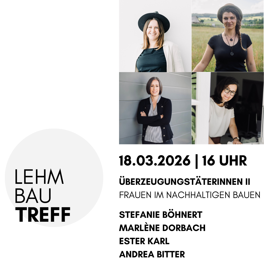 LehmBauTreff 46: Überzeugungstäterinnen II. Frauen im nachhaltigen Bauen. Mittwoch, 18. März 2026 | 16:00 – 17:30 Weitere Infos folgen zeitnah…